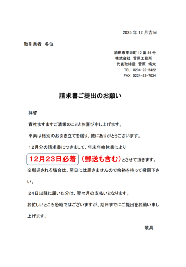 12月分の請求書につきまして、年末年始休業により12月23日必着(郵送も含む)